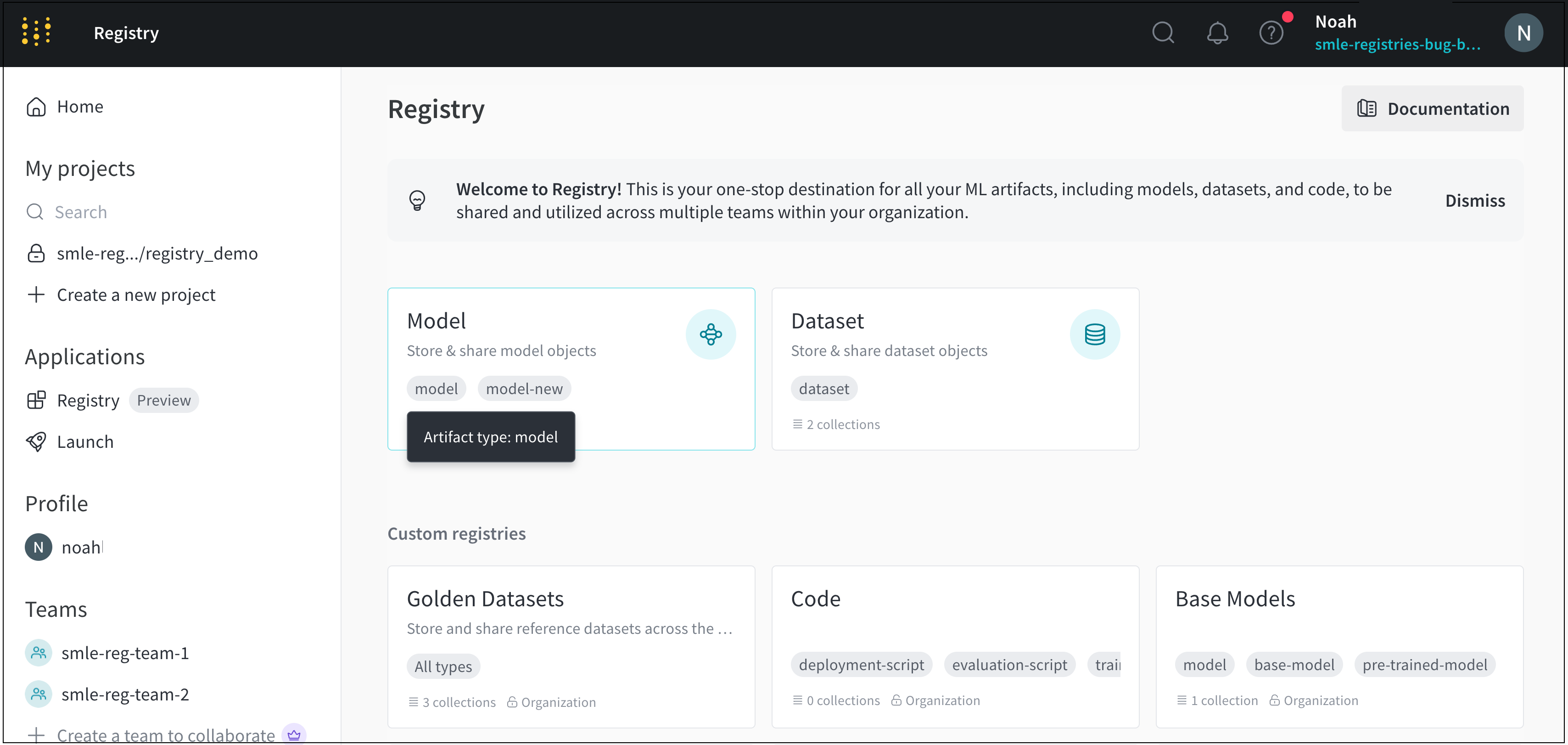 例えば、前の図はレジストリ アプリのホームページに複数のレジストリ カードを示しています。Modelレジストリカード内で、2つのアーティファクトタイプ: model と model-new を見ることができます。